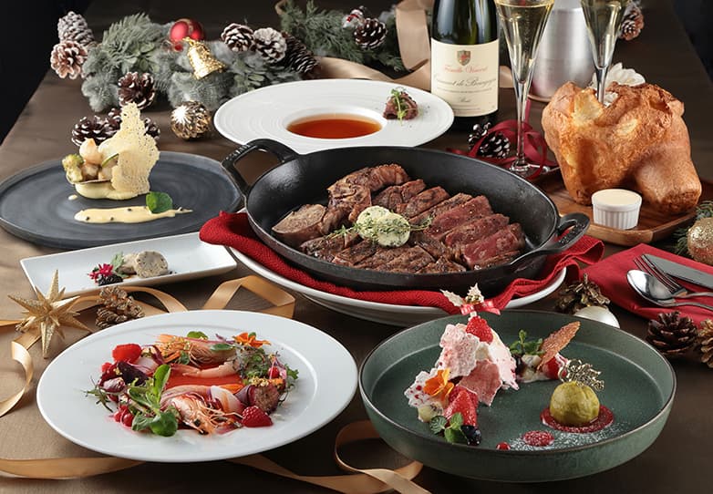 希少価値の高い特選神戸牛を含む4種類から選べるメインのステーキと共に、濃厚で滑らかなフォアグラテリーヌ、天使の海老とサーモンリエットを重ねた贅沢な前菜、鴨の旨味が広がるスープ、新鮮な蝦夷アワビと帆立貝柱のフリカッセなど、聖夜にふさわしい美食の数々をご用意いたします。